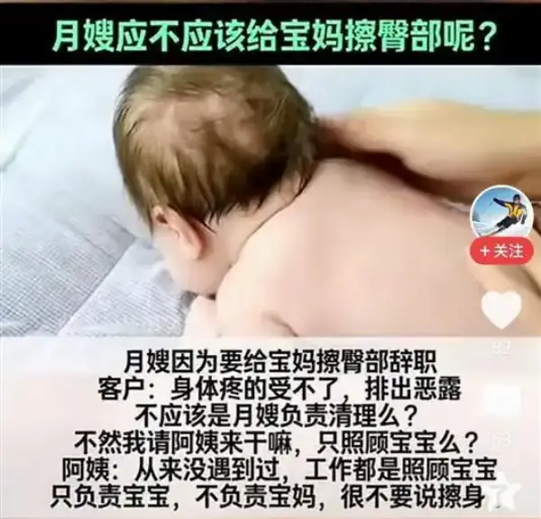 最近网上有个事讨论得挺热闹,上海一位刚生完孩子的宝妈,身体正难受着,排出恶露后自己实在处理不了,就请家里雇的月嫂帮忙清理一下臀部。没想到月嫂一口拒绝了,理由是自己“从来没遇到过这种事”,她的工作就是照顾宝宝,不负责照顾宝妈,更别说擦拭身子这类私密护理了。雇主一听就急了:你不照顾我,我请你来干什么?光照顾宝宝那叫育婴师,不叫月嫂啊!月嫂不就是照顾“坐月子”的人吗?宝妈和宝宝难道不都应该在照顾范围里?不少网友觉得这位月嫂说话太欠考虑,缺乏基本的职业素养和同理心。这种事搁谁身上,恐怕都得把这样的月嫂给辞退了。